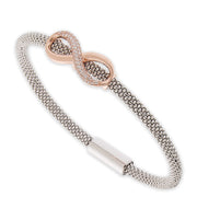Silver ladies infiniti bangle with cz'd on a rose colored infiniti insignia. Bracelet features a magnetic clasp